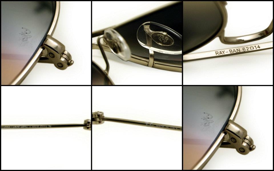 Frame colour: Silver Lens: Glass with UV400 protection Lens colour: Grey Gradient The Rb Engrave in the left lens Word 'rayban made in Italy' print on right leg On the left leg have printed the model and size. RB interlocking at Nose Pad size mark on the bridge between lens