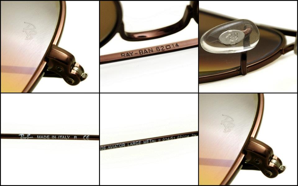 Frame colour: Gold Lens: Glass with UV400 protection Lens colour: Brown Gradient The Rb Engrave in the left lens Word 'rayban made in Italy' print on right leg On the left leg have printed the model and size. RB interlocking at Nose Pad size mark on the bridge between lens